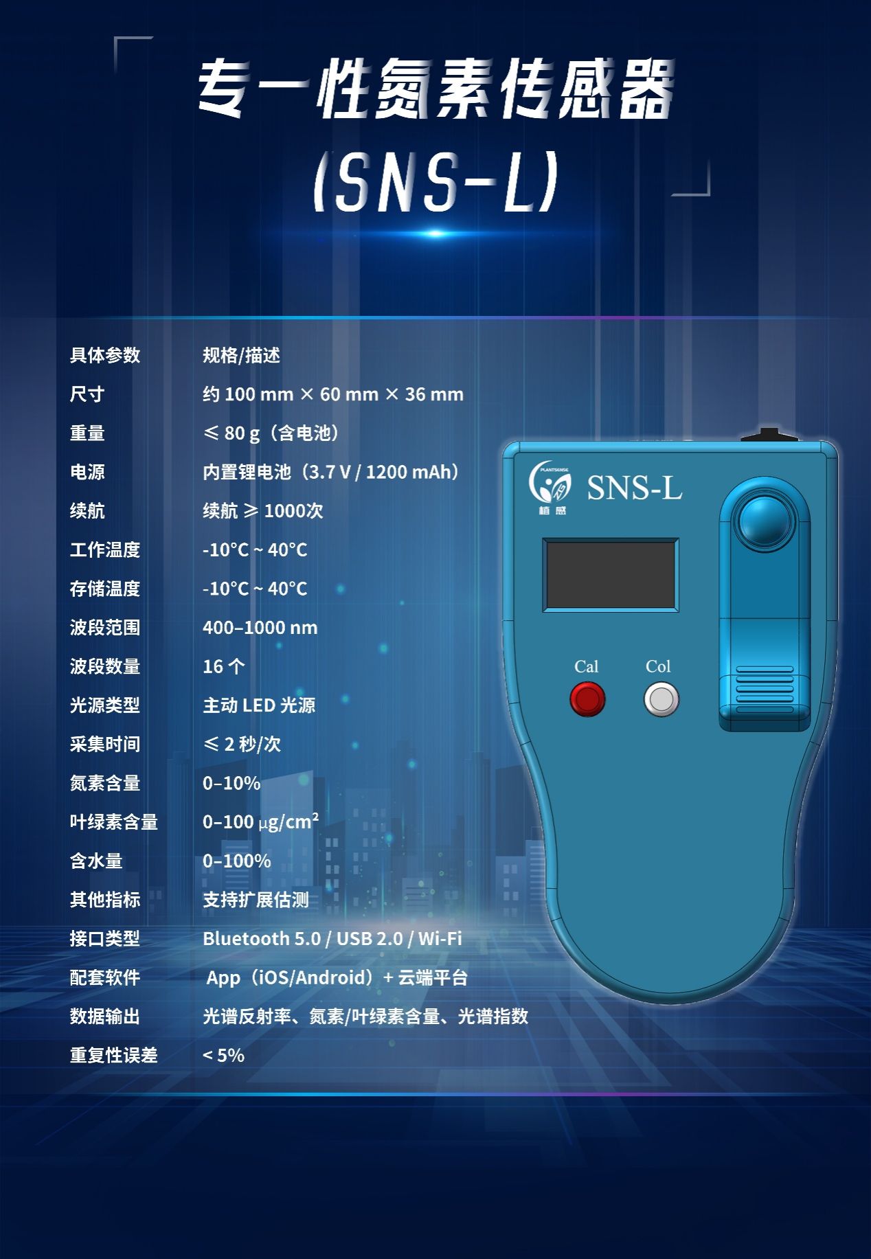 本次展出的SNS-L传感器是李斐教授团队在作物营养智能监测领域持续钻研二十年的成果。围绕作物氮素诊断与光谱监测,团队历经多代技术迭代与结构优化,逐步形成了具备自主知识产权的传感器系统。该传感器覆盖400–1000 nm的16个光谱波段,可同步获取作物叶片多通道光谱信息,并内置玉米、马铃薯的氮素与叶绿素估测模型。通过配套手机App或云端平台,用户可实时查看光谱曲线、养分数据,方便田间诊断、实验记录与教学示范。