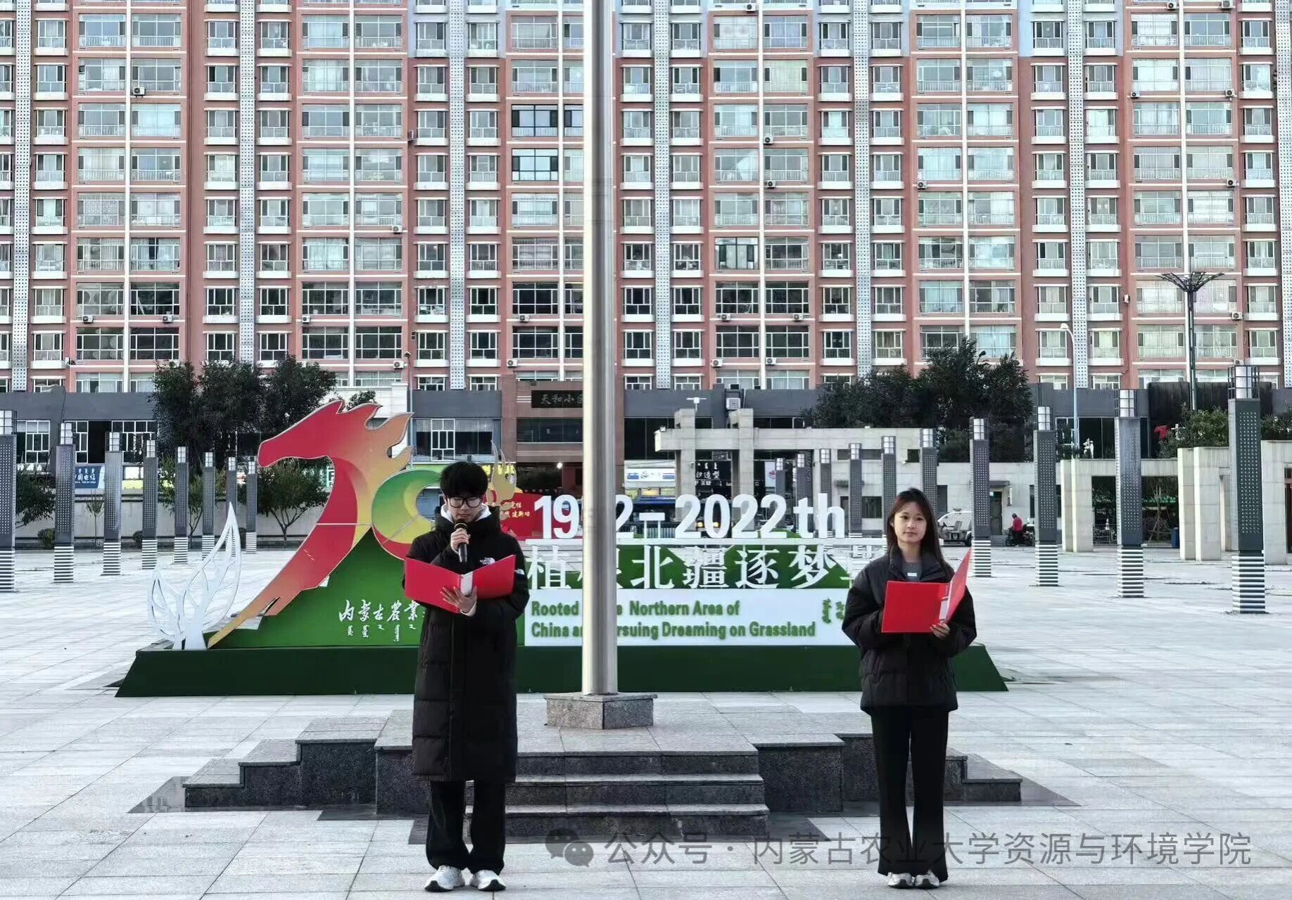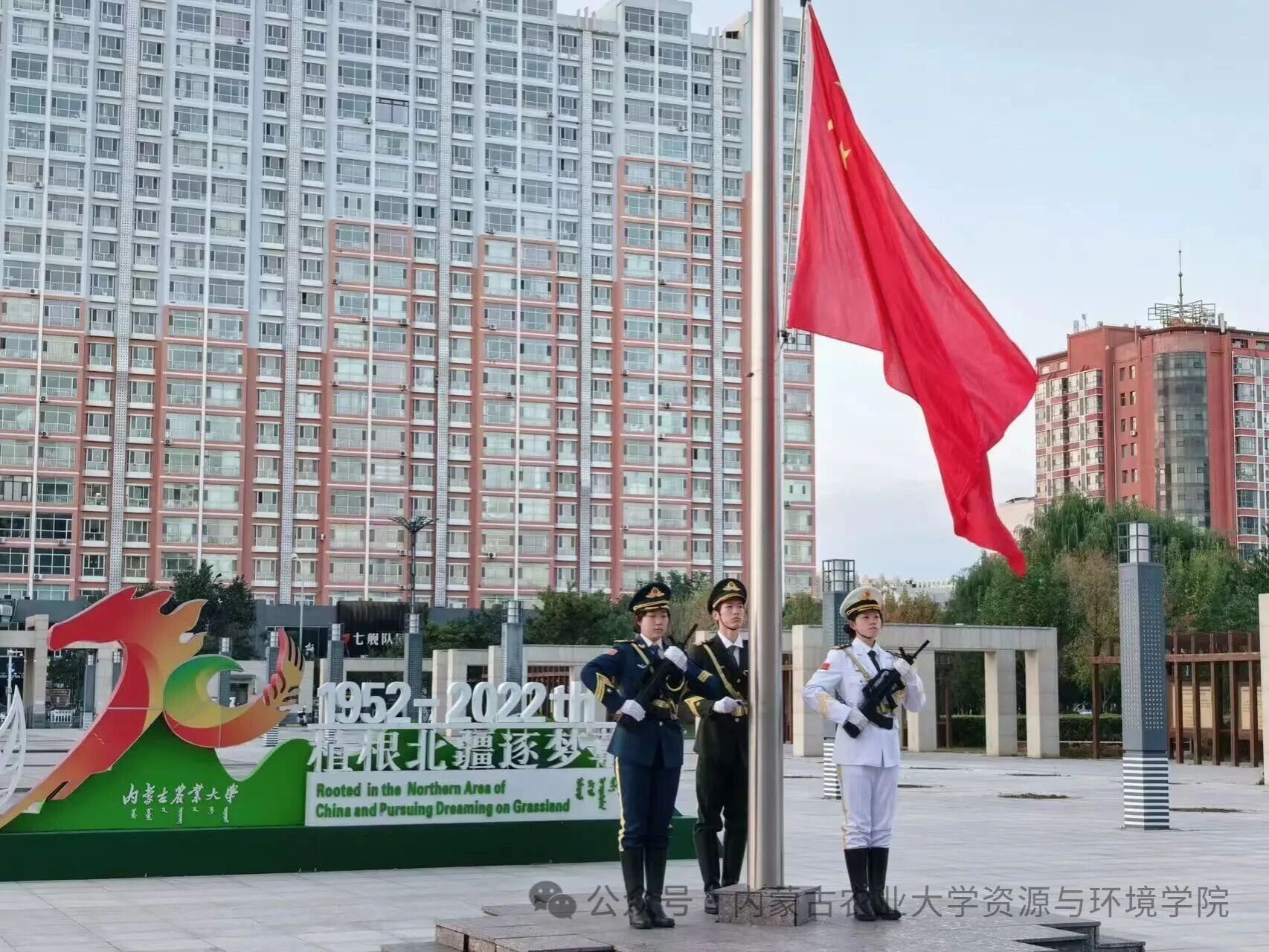 10 月 20 日上午 7 时,内蒙古农业大学资源与环境学院在生命与科学大楼前举行升旗仪式,学院师生齐聚现场,共同感受庄严氛围,凝聚强农报国力量。升旗仪式上,国旗护卫队迈着整齐步伐护送国旗入场,伴随着激昂国歌,五星红旗冉冉升起,全体师生庄严肃立,行注目礼。